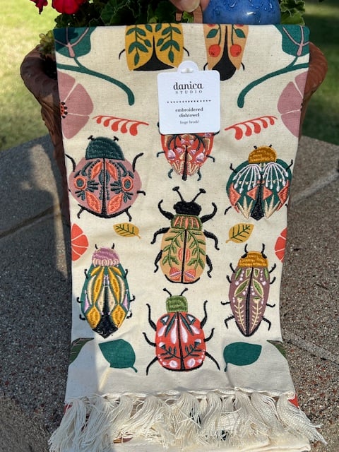 Ensure all your culinary creations come to fortunate fruition by accessorizing your kitchen with this multicolored Amulet Embroidered Dishtowel. Insects, reptiles, flowers and feathers in a gorgeous array of rich hues weave a powerfully protective spell over your cooking efforts, and tasseled trim adds a lighthearted touch.
