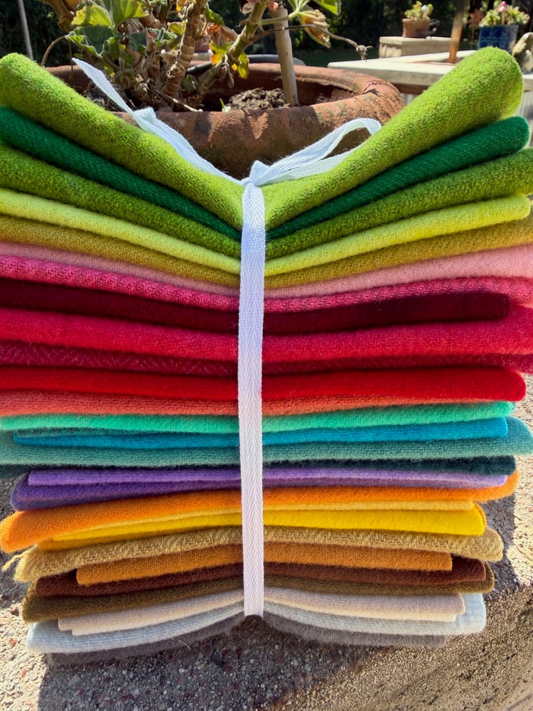 This is a collection of 34 pieces of hand dyed wool. There are a couple of milled dyed wool included. Each piece measures a minium 6" x 8". Some of bigger.