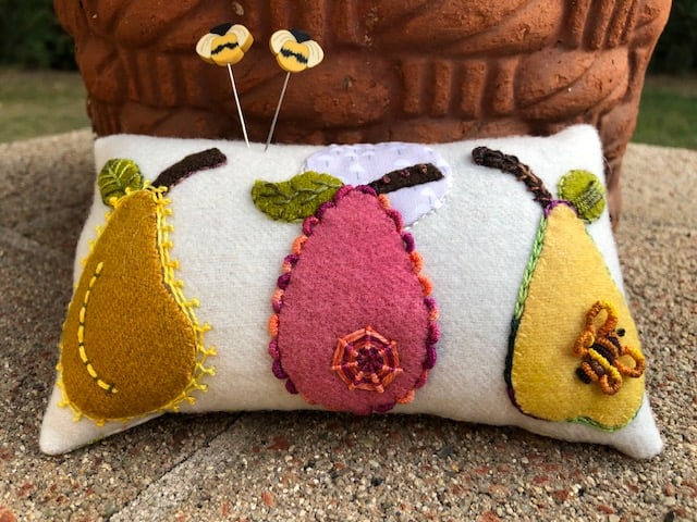 Kit and Pattern to make this cute little 4" x 6 1/2" pin cushion. A great beginner's project to learn wool applique. The kit includes the fabric. Threads and Bee pins are not included. Cotton backing fabric can very due to available supplies.