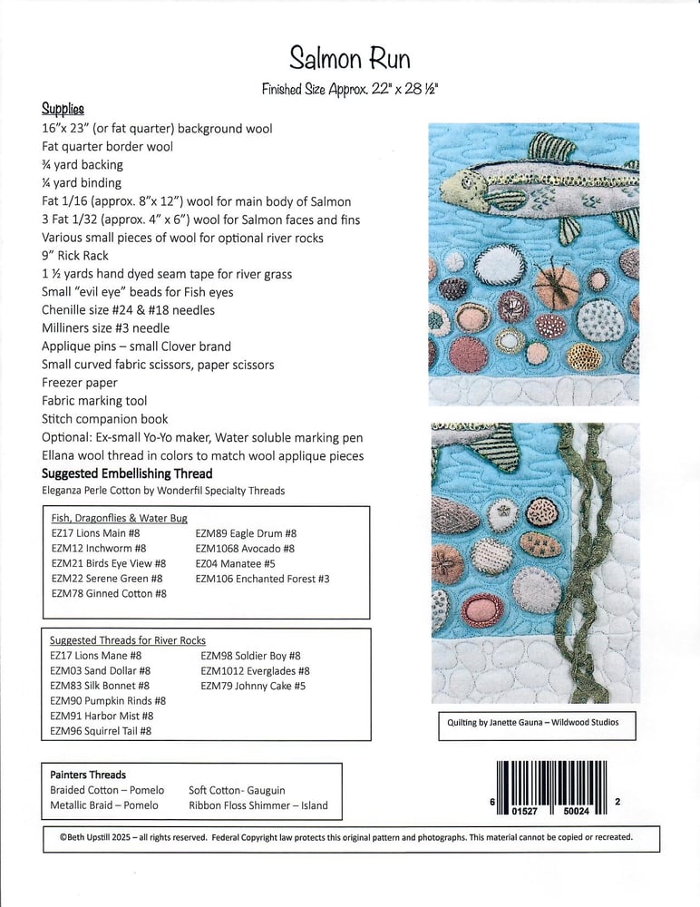 Stitch a series of Salmon fish along with river rocks and bugs. Pattern comes with full size templates, detailed instructions and color photos.